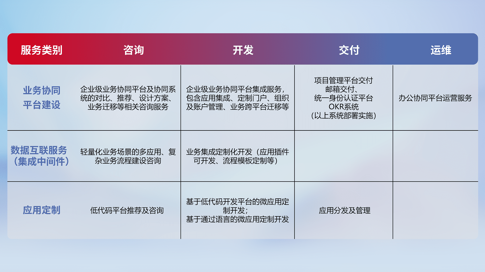 针对钉钉、、、企微、、、、IDaas等平台级产品提供产品的规划、、、方案、、交付、、、定制化开发等服务,,,,实现如统一协同办公、、、智能客户服务、、混合会议管理、、智能数据查询、、、、等业务场景,,,,实现数字化转型。。。。