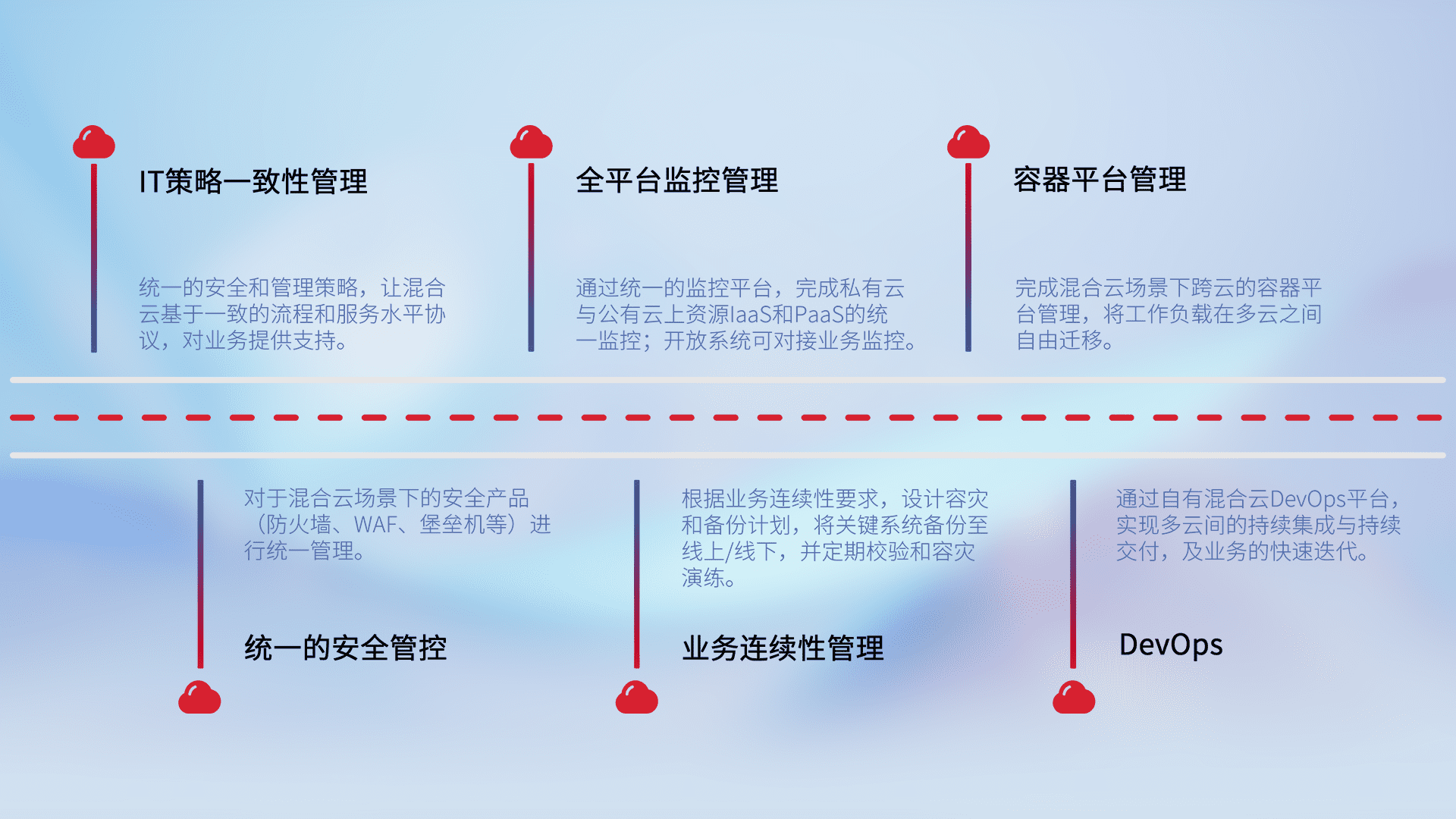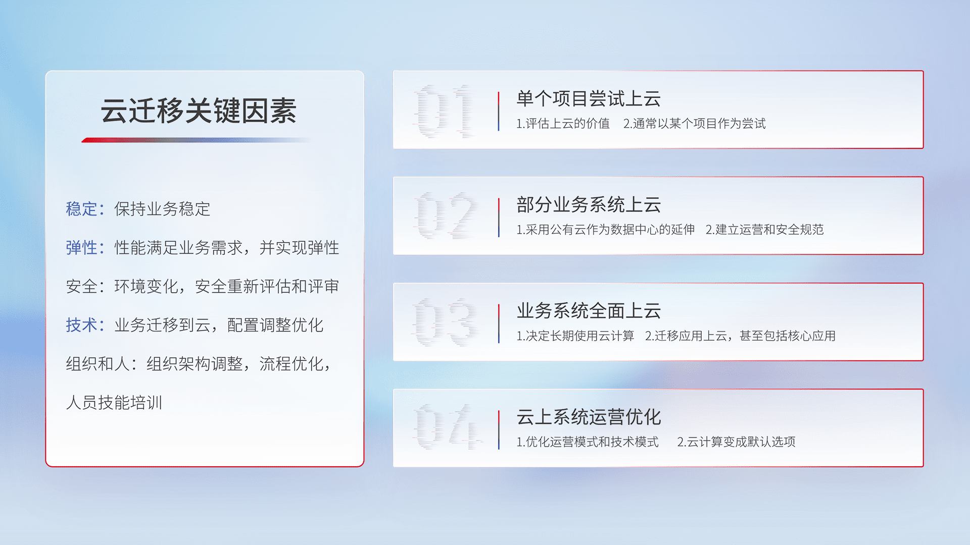 结合实际业务,,,从规划设计、、、云平台选型、、、、云原生改造、、数据迁移、、、集成交付,,,,迁移全过程为客户识别最佳上云路径,,做好风险识别管理,,,,设计网络架构、、、身份权限、、安全审计合规、、、、操作审计、、日志审计、、、监控告警策略、、多站点容灾设计等,,,对云上基础设施进行整体规划,,,提升IT治理水平,,以满足弹性、、、、高可用、、、、高性能的需求。。