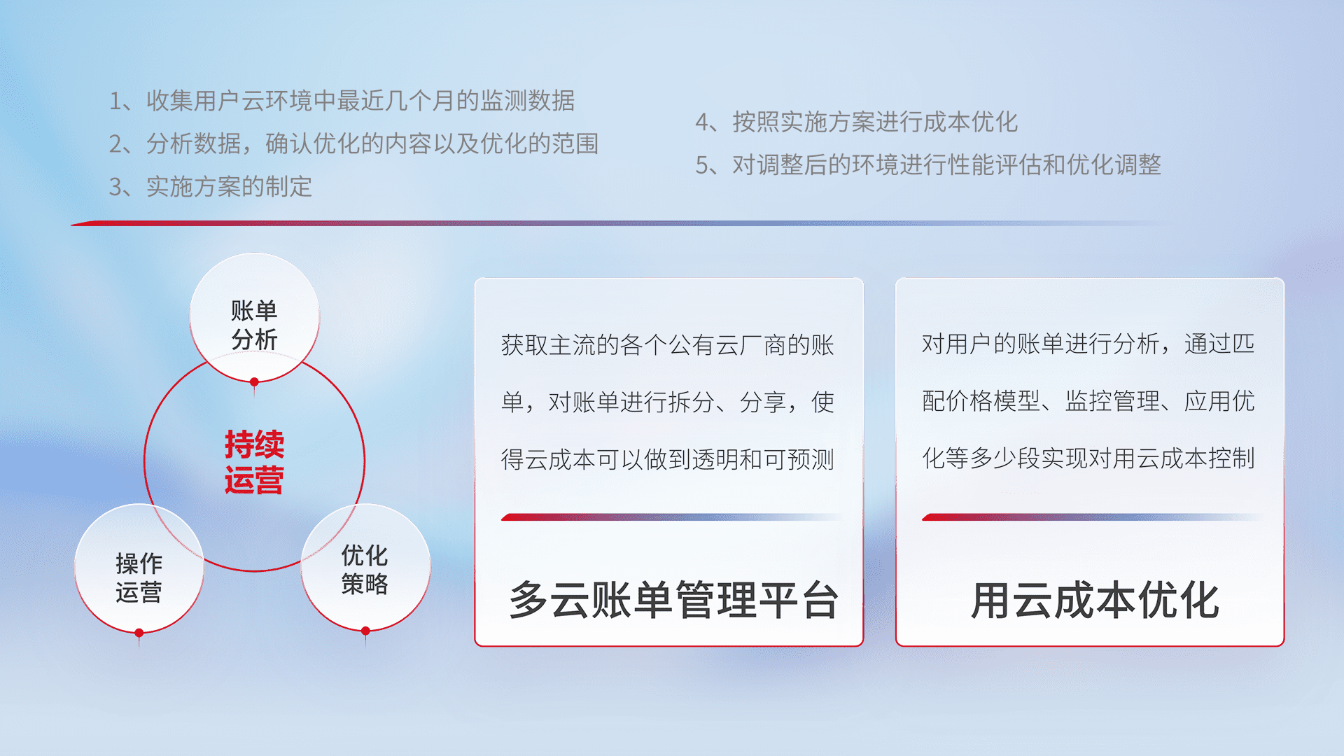 通过多云纳管,,,,以统一的资源数据模型把客户的云资源进行抽象和封装,,,进而实现对多云资源的统一操作,,,保障云资源管理的可靠性、、稳定性与可用性。。。量身定制化运维内容,,,配置、、开发运维、、、补丁管理、、备份、、监控、、认证和访问管理、、审计和日常巡检等,,,,保障在用云过程中的可靠度,,,,稳定度以及高可用率。。。。